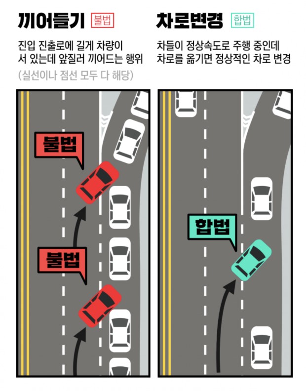 위 사진과 같이 ' 끼어들기 ' 로 간주되는 경우는 , 차량들이 정체되어 있거나 서행중일 때 안전거리를 미확보하고 그 사이를 비집고 새치기하는 행위이며, ' 차선 변경 ' 은 차량 사이의 충분한 공간 확보 및 모든 차량이 정상 주행중일 때 차선을 변경하는 것으로 교통 흐름을 방해하지 않으므로 합법입니다.