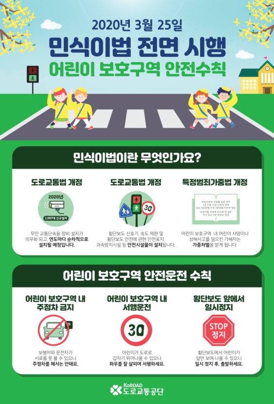 • 안전표지 및 신호등 설치: 어린이 보호구역임을 알리는 표지판신호등, 횡단보도가 설치됩니다.